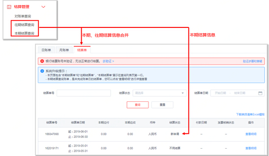 同时,老菜单中“本期结算查询”和“往期结算查询”的页面信息统一合并到新菜单“账单查询”的“结算单”页面;“结算单”页面中“结算状态”为“未到结算日”或“新申请”的为本期结算信息。