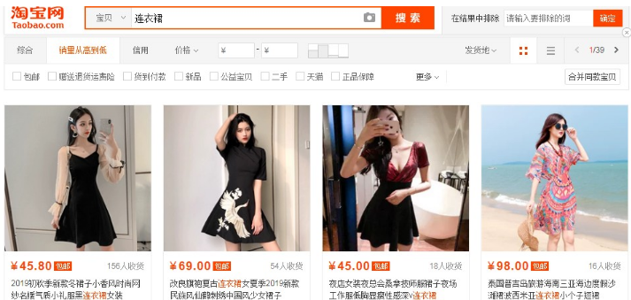 虽然我们搜索连衣裙,会有上千万的宝贝。但是我们一定要看到,衣服的的款式、风格、品牌、材质、每个人的购买热点等是非常多样性的。在这里只有和你相同,相似的宝贝才有可能和你有竞争的交集。这样经过筛选后竞争对手会少很多!我们看下图,“连衣裙”这个千万宝贝的大类目,在我们限制条件之后,我们发现,类似的宝贝已经只有39页。