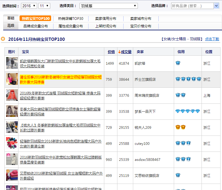 以下是生e经选款工具,如何选款,通过往年市场的一个销量来分析,比如你是卖羽绒服的,那么我们就分析一下2016年卖的比较好的款式: