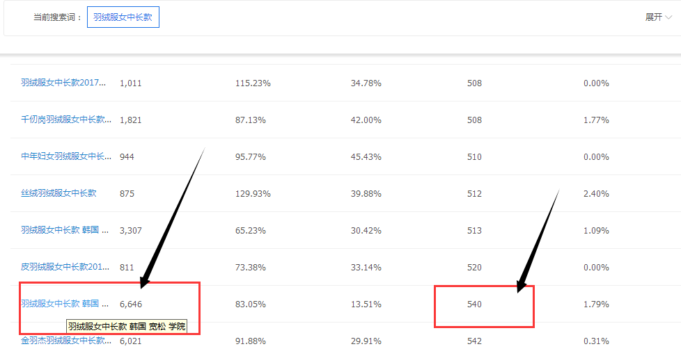 然后去筛选搜索人气高的词。比如上图的:轻薄羽绒服女中长款,就是比较不错的词。