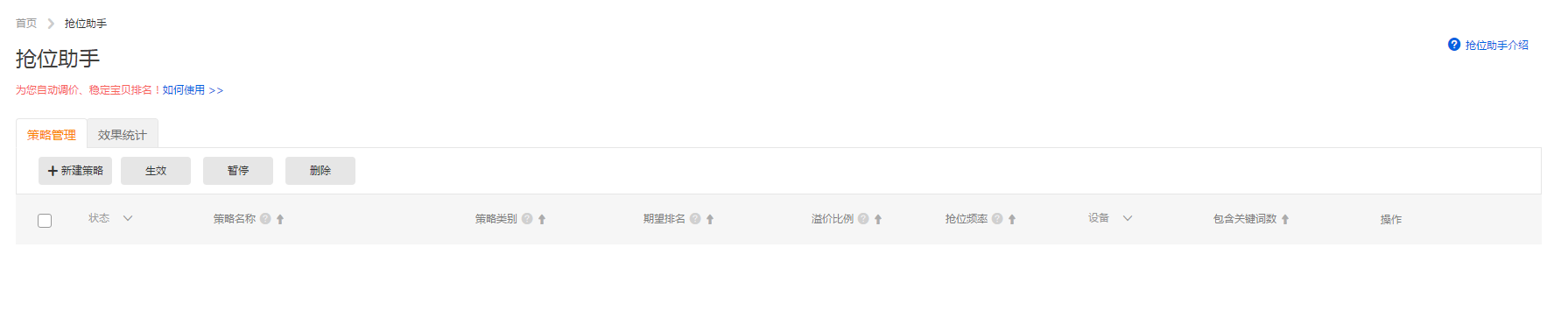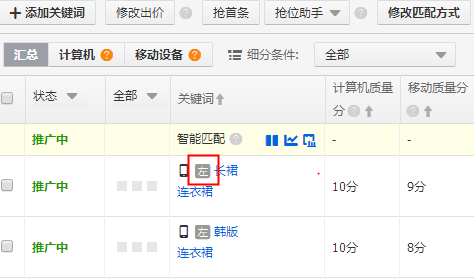 二.抢位助手能开哪些词抢位助手并不是所有词都开,一般我们开抢位助手的词是我们的主产品下面的少部分的重点关键词,基本上市场竞争较多的大词占大多数,因为这部分词的市场竞争浮动较大,我们会在他权重不高,且排名不高的情况下考虑使用投放。在前期这个词并不是很稳定,出价高是一回事,排名也会经常变化,这个时候我们就可以使用抢位助手进行自动调整。