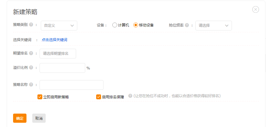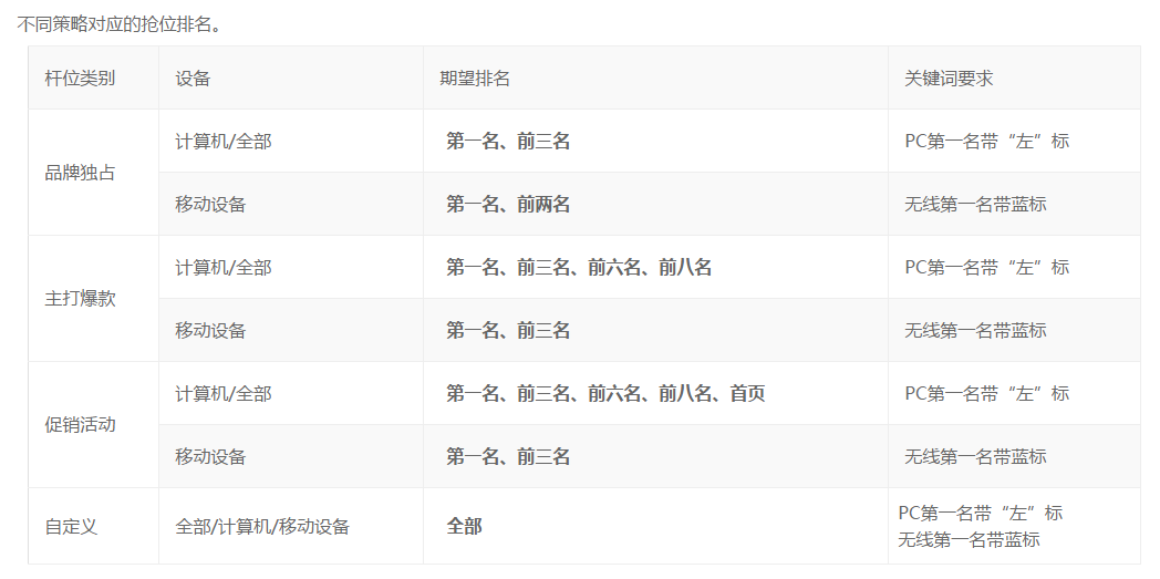 5)策略名称策略名称自己去设置,随便设置,自己知道就行不同策略的要求与可以设置的期望排名位如下表。