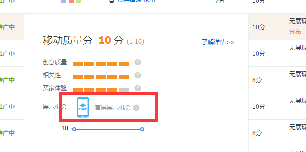 在这里需要注意的是,如果你想要抢夺第一名,首先你要确保你的所选关键词拥有首屏展示的机会,何为首屏展示机会?无线端的蓝色手机标签(无线质量得分7-10分)