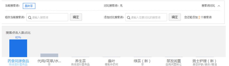 大部分人在潜意识里面肯定觉得桑叶茶是放在茶这个类目下的,但是当你去后台看的时候,就会发现其实不然,桑叶茶83%的搜索点击人数是来自药食同源食品子类目的,有且只有10%左右的是在代用/花草茶这个子类目,也就是说,桑叶茶放在药食同源下面,你被搜索到的可能性更大。而你要是放在茶类目下,你展现的机会几乎为0,就是不管你花多大的精力,多少钱,你的收获也是很小的。