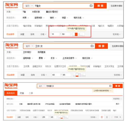 如果你的T恤准备卖的价格期间是在11——50之间的,那么你的卫衣女就最好在43——65之间,然后你的羽绒服女在295——345之间,在这种情况下,不同季节的商品是在同一个价格区间的,定位是符合的。