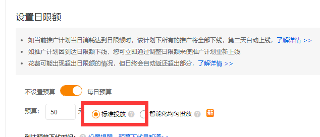 不要选择智能化投放,这样系统会均匀一天的分布宝贝,数据不精准,日限额单品一天100-200左右,想要快点测试出效果可以根据你的自身情况去设置,日限额保持递增的趋势去开,这样可以有效的增加直通车账户权重。